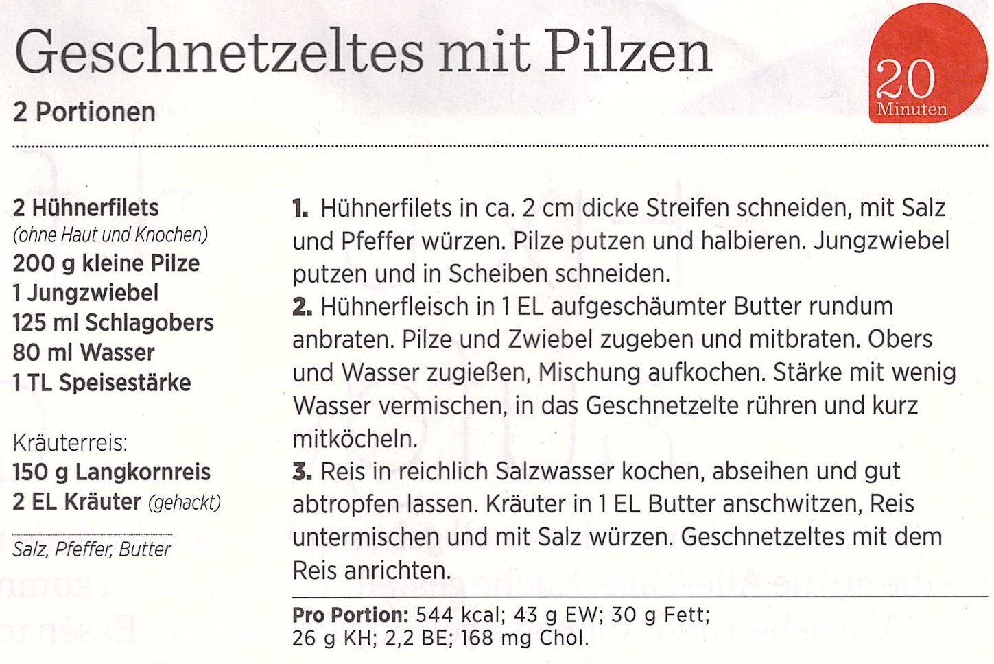 - Hühnerfleisch in 1 EL aufgeschäumter Butter rundum anbraten. Pilze und Zwiebel zugeben und mitbraten. Obers und Wasser zugießen, Mischung aufkochen. Stärke mit wenig Wasser vermischen, in das Geschnetzelte rühren und kurz mitköcheln.