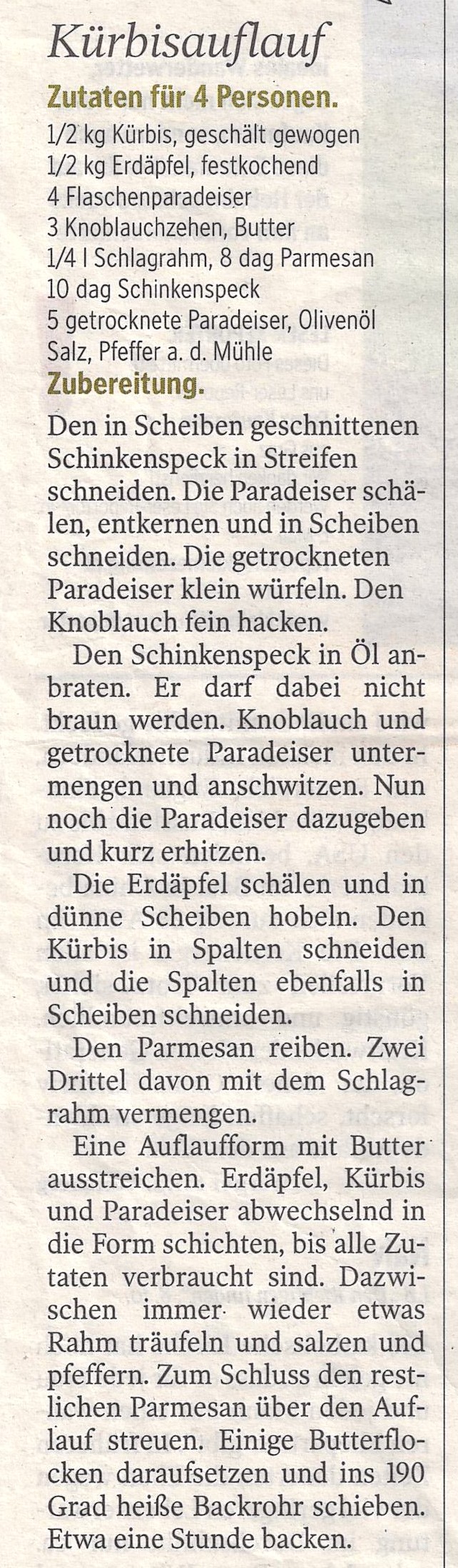 - eine Auflaufform mit Butter ausstreichen, Erdäpfel, Kürbis und Tomaten abwechselnd in die Form schichten, bis alles verbraucht ist; dazwischen immer wieder etwas Rahm träufeln und salzen und pfeffern, zum Schluss den restlichen Parmesan über den Auflauf streuen; einige Butterflocken daraufsetzen und ins 190°C heiße Backrohr schieben und etwa eine Stunde backen.