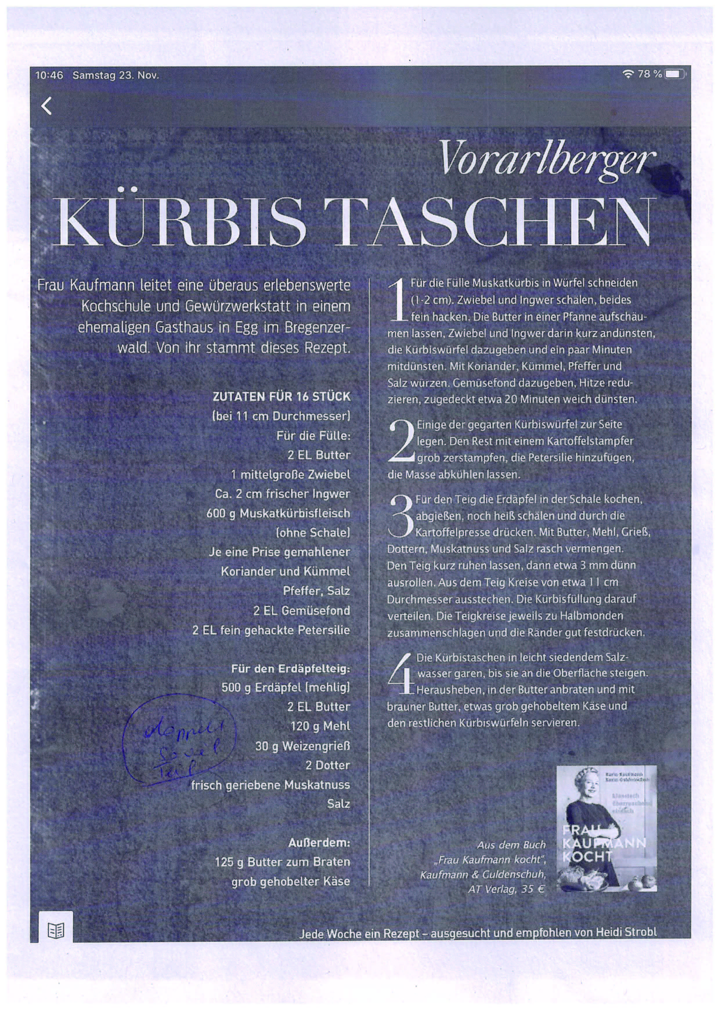 4. Die Kürbistaschen in leicht siedendem Salzwasser garen, bis sie an die Öberfläche steigen. Herausheben, in der Butter anbraten und mit brauner Butter, etwas grob gehobeltem Käse und den restlichen Kürbiswürfeln servieren.